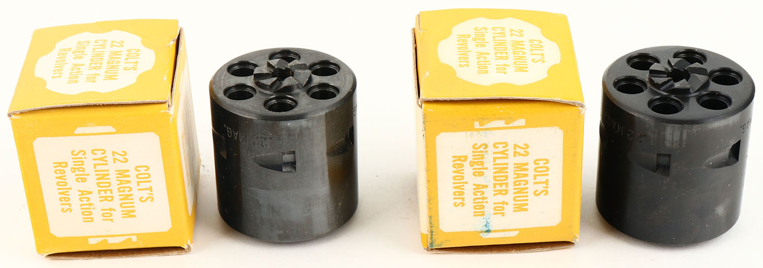 Lot of (2) Colt .22 Revolver boxes, (1) Colt's New Frontier 22, (1) Colt's Peacemaker 22, both boxes contain spare .22 Mag. Cylinders, boxes are solid with minty color, minor corner wear. Grade: Excellent + - Value: 20 to 100