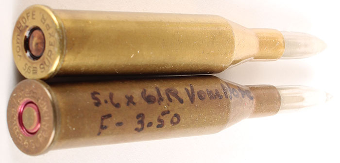 Lot of 2. 5.6x61R Vom Hofe (DWM 431M). (1) HS:''vom HOFE 5/6mm SUPR EXPR'', PT CN FMJ. (1) HS:''vom HOFE B 5,6 SUPR EXPR B'', PT CN FMJ. Grade: Very Good - Value: 20 to 40