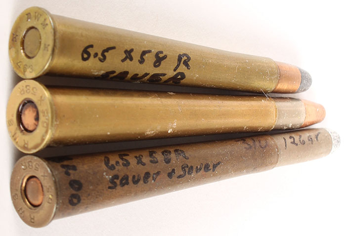 Lot of 3. 6.5x58.5mm Sauer. (1) HS:''DWM K 463 K'', RN CJ SP. (1) HS:''R.W.S. 6.5x58R'', FN CN SP. (1) HS:''R.W.S. 6.5x58R'', FN CN w/ copper cap HP. Excellent - Value: 16 to 60