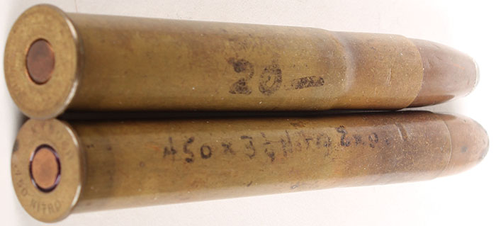 Lot of 2. (1) .476 Westley Richards Nitro, HS:''KYNOCH .476 NITRO. RN CJ SP. (1) .450x3.25'' Nitro. HS:''KYNOCH .450 NITRO. RN CJ SP. Grade: Very Good - Value: 16 to 60