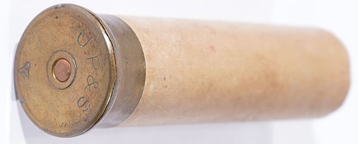 | J.P.S. No. 4, 4ga, NPE tan paper shot shell, 4'' OAL, shell is...