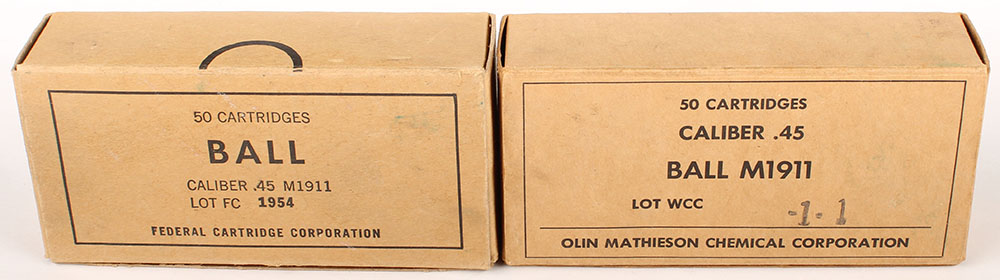 Lot of two, .45 ACP M1911 Ball, 50 Rd. boxes, one Olin box & one Federal box, 1pc, one full one partial 49 Rds., 99 Rds. total, brown box with black print, boxes are solid with handling wear & pen marks, ammo is excellent. Grade: Excellent - Value: 40 to 80