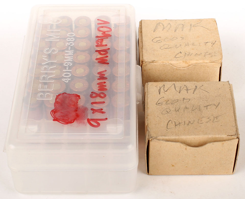 Lot of two, Chinese factory 71, 9x18mm Makarov, 16 count boxes, with 35 Rds. In clear plastic box, copper washed steel case, dated 1993, 1pc, Full carboard boxes, 67 Rds. Total, brown boxes with no label, cardboard boxes have pencil marks, ammo is very good, likely has corrosive primers. Grade: Very Good ++ - Value: 20 to 40