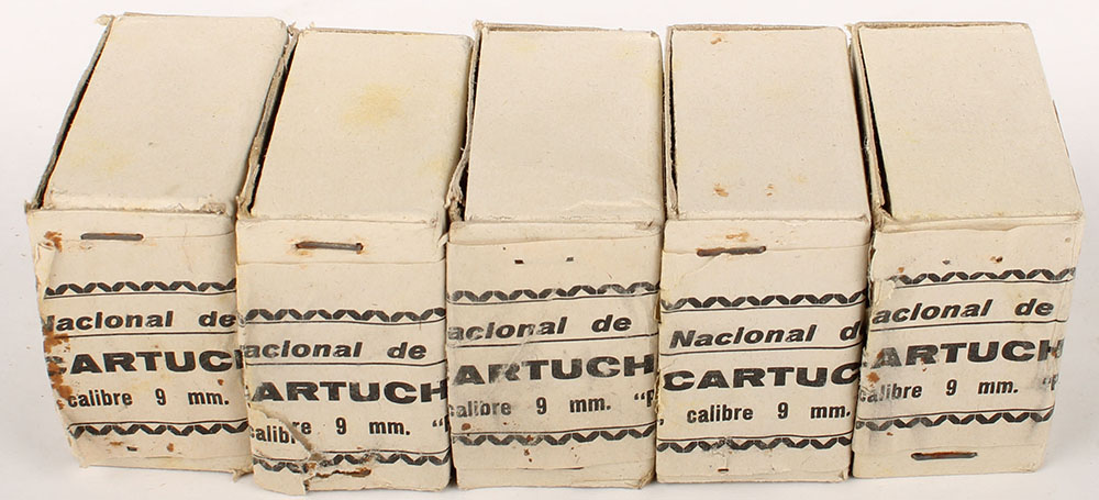 Lot of five, Fabrica Nacional de Toledo (Spanish), 9mm Parabellum (9x19mm), 25 count boxes, brass case, ammo in open boxes dated 1951, 1pc, one SEALED, three are open & full, one is partial 10 Rds., total of 110 Rds., white box & label with black print, ammo ranges from excellent to good, likely has corrosive primers. Grade: Excellent - Value: 20 to 60