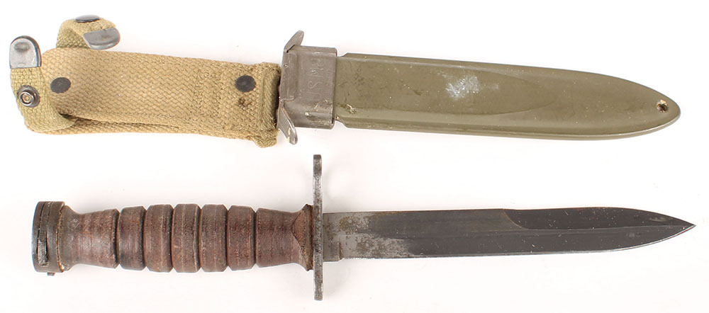 US, Camillus Cutlery Co., M4 bayonet & M8 sheath. Leather grip. Parkerized metal, has spots of wear & cleaned rust, bottom of guard has rust. The top of the guard is marked ''U.S.M4'', ''CAMILLUS'' the sheath has chips, dings, rust, & wear. The sheath is marked ''U.S. M8'', ''B.M.CO''. Grade: Very Good + - Value: 100 to 250
