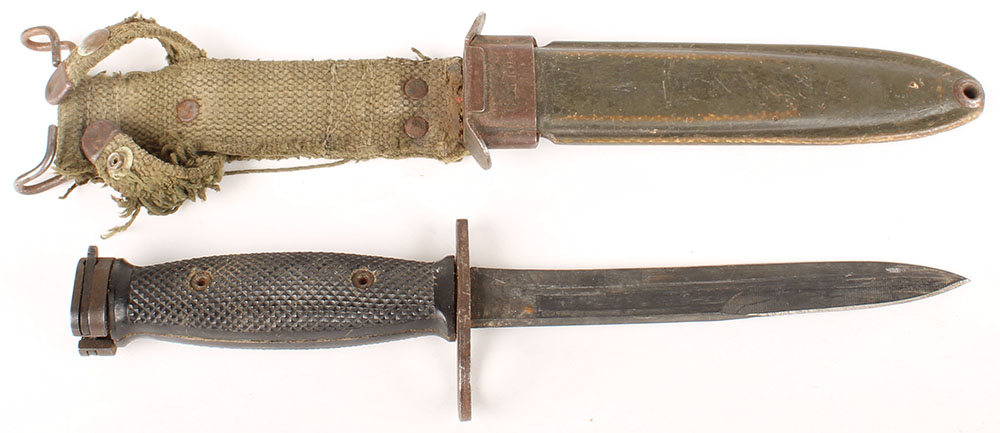 US, General Cutlery Inc., M7 Bayonet with M8A1 sheath, checkered black plastic grips, parkerized metal, spots of thinning & rust, top of guard marked ''U.S. M7'', ''GEN CUT'', sheath marked ''U.S. M8A1'', with a crown proof. Grade: Very Good - Value: 50 to 100