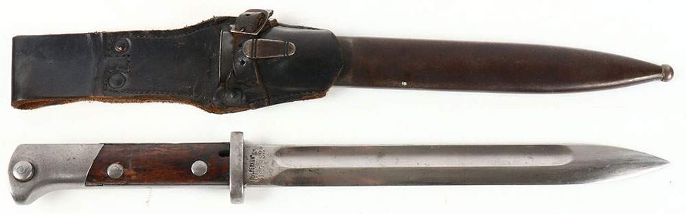 RARE!, Polish, Society of the Motors Factory Perkun, WZ 29 Bayonet, with sheath & frog. Smooth wood grips, metal in unfinished. The left side of the blade is marked with a crowned eagle over ''W.P.'' (Wojsko Polskie = Polish Army). The right side of the blade is marked ''A'', ''PERKUN'', ''167882''. The right side of the guard is marked ''481855''. The sheath has finish thinning & spots starting to tone brown. The leather frog has some cracks & stains. A very rare bayonet with not many being made, & most of what was produced was either destroyed, or captured & modified by the Germans for use with their rifles. Grade: Excellent - Value: 250 to 500