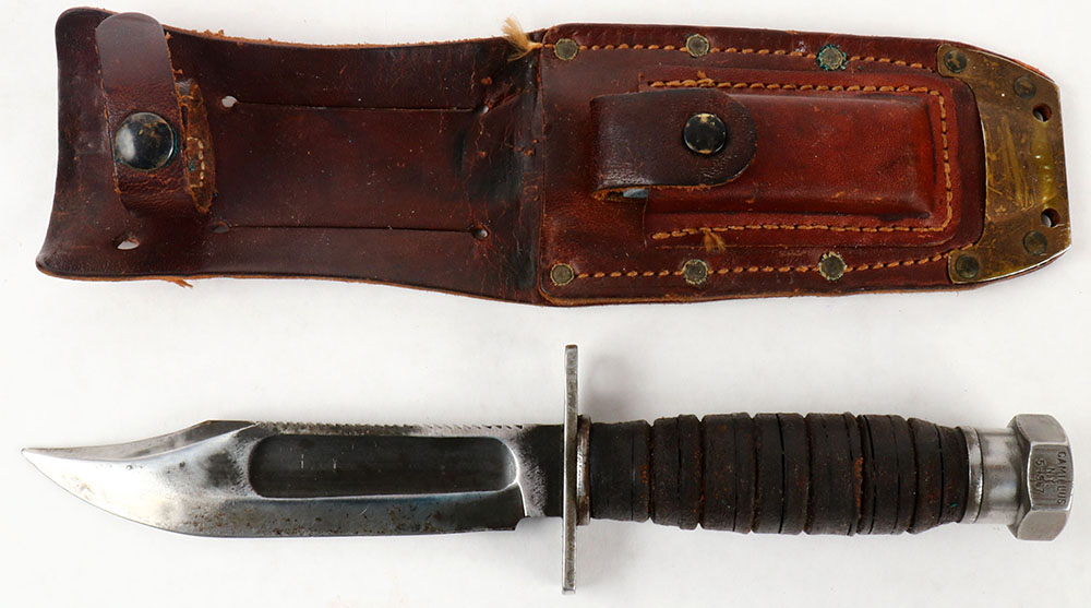 US, Camillus Cutlery Co., Vietnam Jet pilot survival knife, with sheath, & sharpening stone, leather handle, unfinished metal with areas of dark patina on blade. The left side of pommel is marked ''CAMILLUS'', ''N.Y.'', ''5-1967''. Leather sheath has worn markings on back. Grade: Very Good - Value: 40 to 80