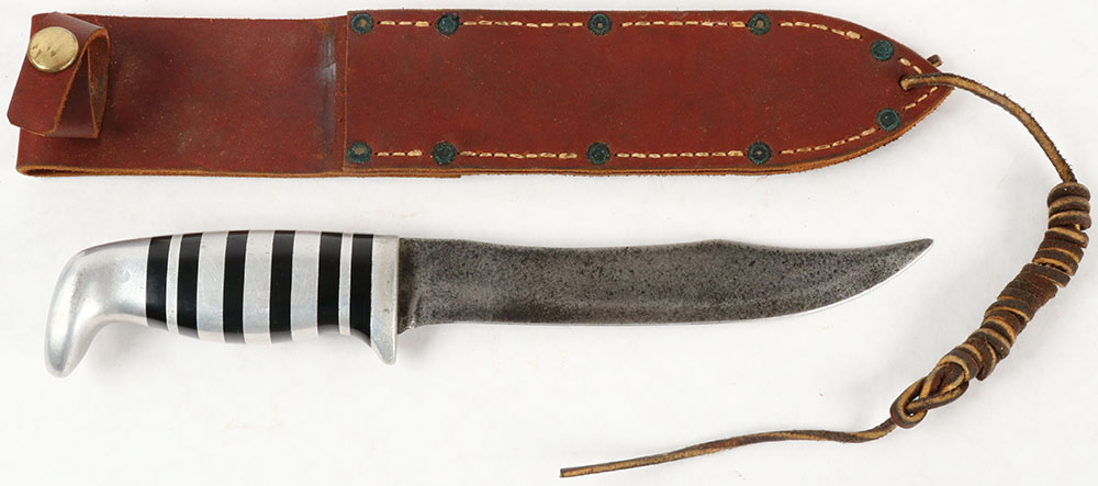 US, Theater made fighting knife with sheath, aluminum grip with black stripes, steel blade, blade has dark speckled patina, 6 5/8'' blade, OAL 11''. Grade: Very Good ++ - Value: 20 to 60