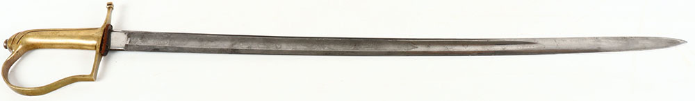 US, W. Clauberg, NCO foot officer sword, circa 1810's-20's, brass handle/guard, has patina & small dings. blade has minor spots dark patina. Both sides of blade are etched with intricate designs of American eagles, anchor, ''US'', ''NCO'', & other designs. Left side of blade is etched ''IRON PROOF'', & stamped ''W.'', ''CLAUBERG'', ''SOLINGEN'', around a knight. Grade: Excellent - Value: 100 to 300