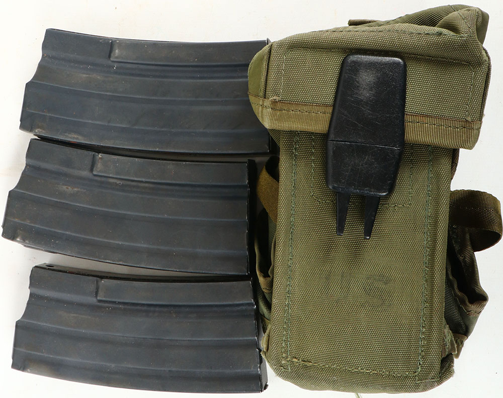 US, LC1 Alice, M16 mag pouch, Nylon, can hold three 30 Rd. M16 Mags, has two pouch's on the sides for grenades, comes with three 20 Rd. Ruger Mini-14 mags. Grade: Excellent - Value: 30 to 60