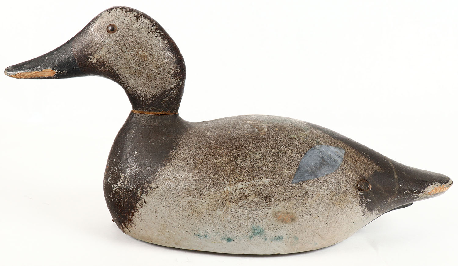 Canvasback Hen by Evans Decoy Company, Ladysmith, WI, 1921-1932, Standard grade, glass eyes, hollow wood, original paint shows wear, 14 1/2'' OAL. Grade: Very Good ++ - Value: 100 to 300