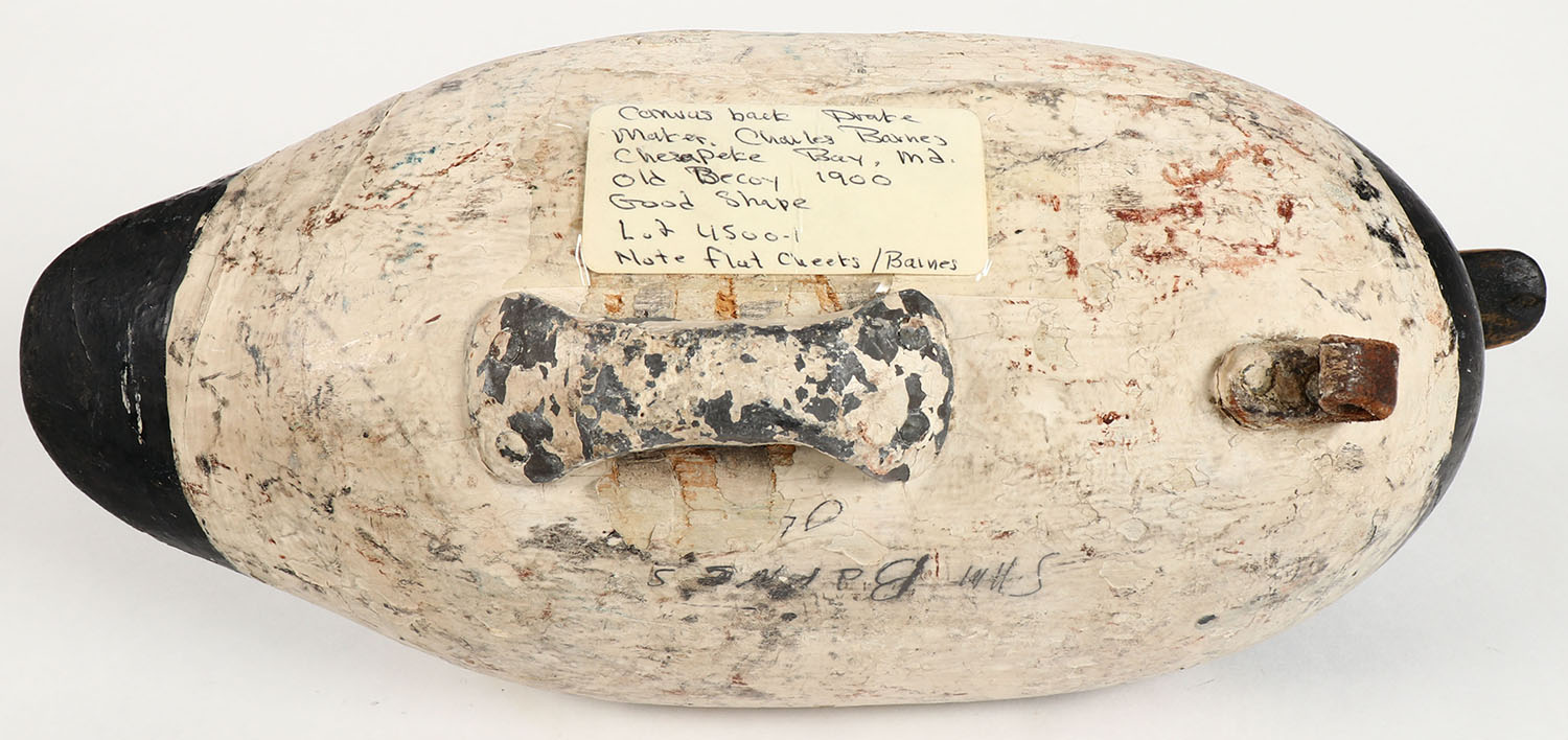 Early Canvasback Drake by Charles Barnes, Chesapeake Bay MD, circa 1900's, PE, old working repaint, leather line tie, show high hairline neck crack. 14 1/2'' OAL. Grade: Very Good - Value: 50 to 100