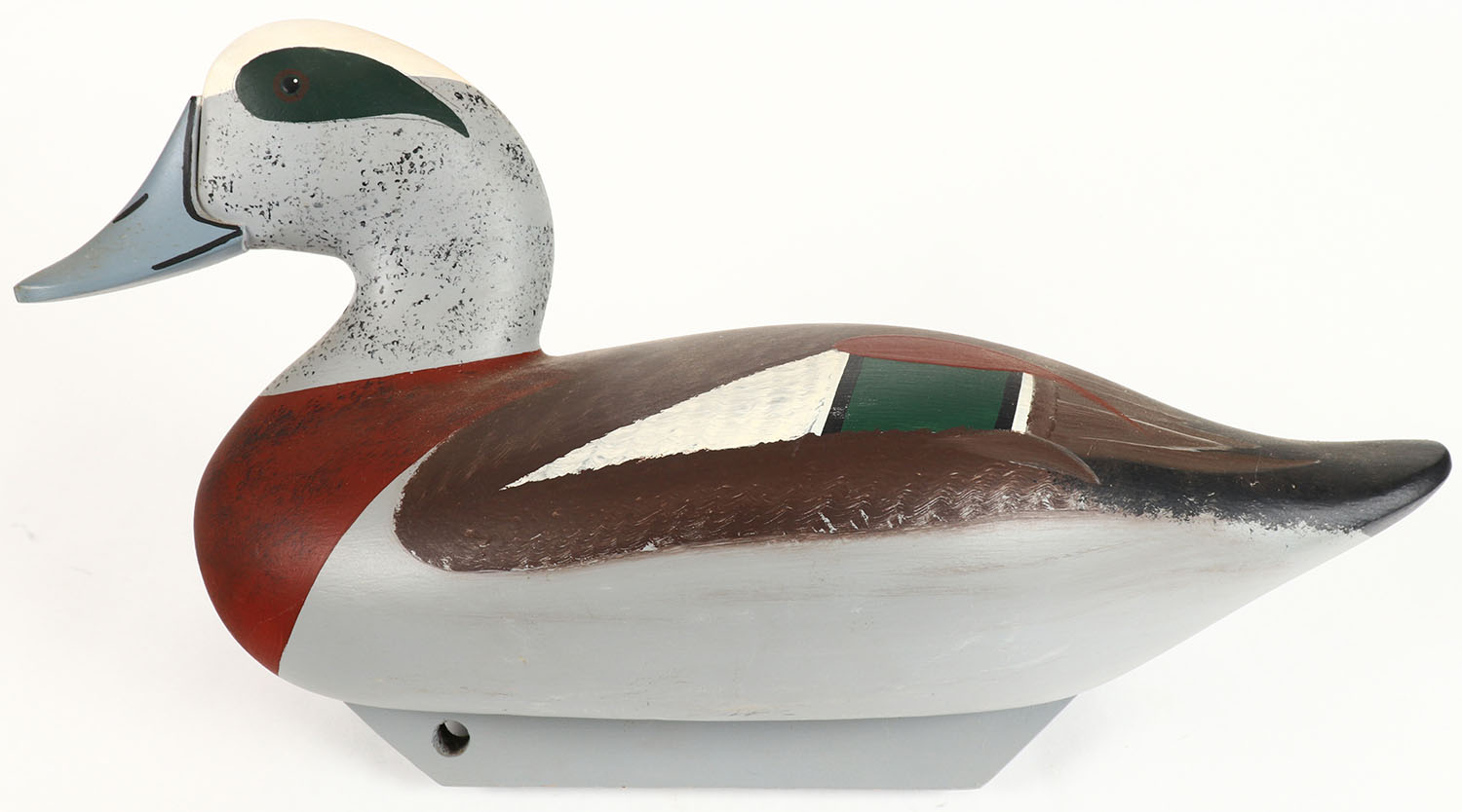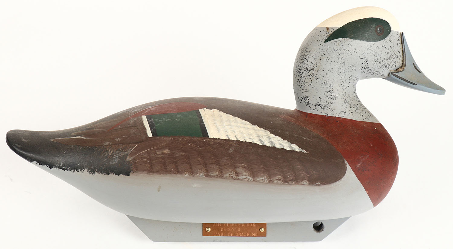 Widgeon Drake by Jim Pierce, Havre De Grace MD, painted eyes, solid wood, structurally excellent, signed Jim Pierce & stamped ''JP'' on bottom, 15'' OAL. Grade: Excellent + - Value: 50 to 100