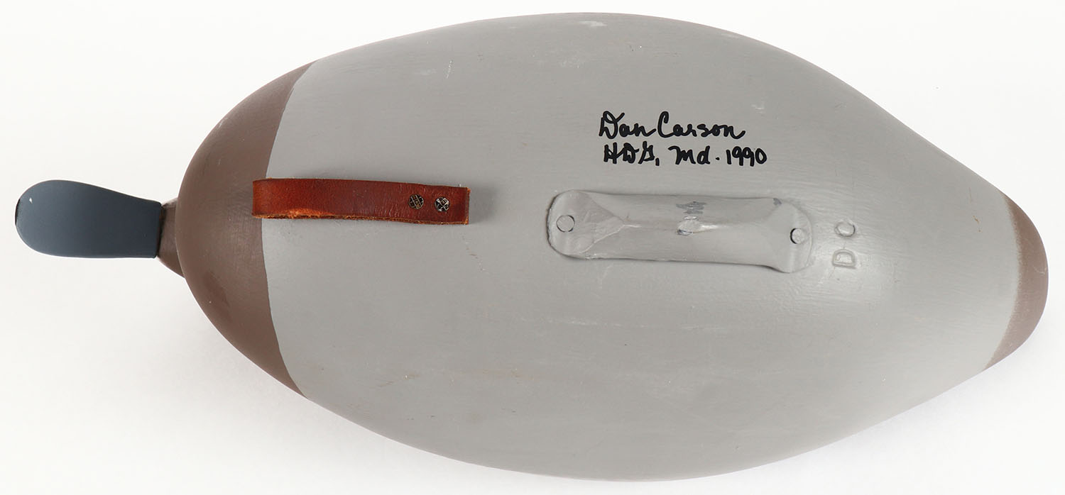 Bluebill Hen by Dan Carson, Havre De Grace, MD, PE, solid wood, original paint, structurally excellent, signed on bottom, 15'' OAL. Grade: Excellent ++ - Value: 40 to 80