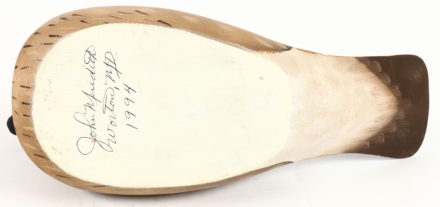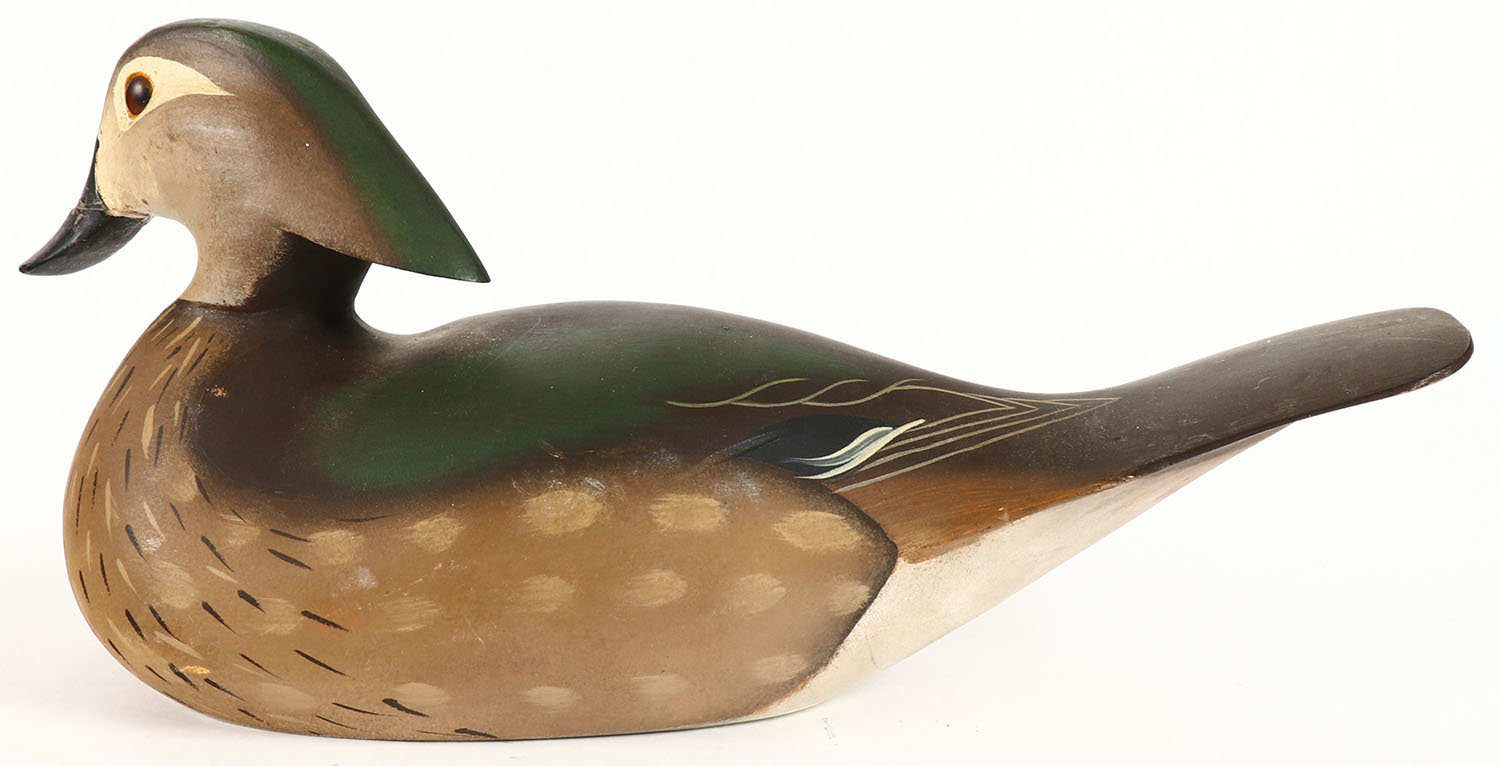 Woodduck Hen by John Meredith, Worton MD, GE, hollow wood, original paint, has a repair crack to bill, 13'' OAL. Grade: Very Good ++ - Value: 40 to 80
