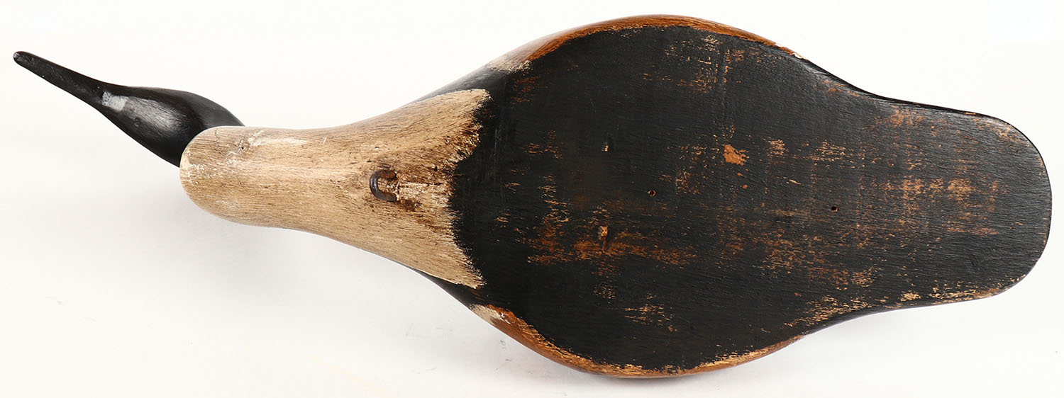 Hooded Merganser by unknown maker, GE, solid wood, has early copper patch on back with nails that has original paint over the top, has metal hood on top of head, 22'' OAL, Grade: Excellent - Value: 10 to 100