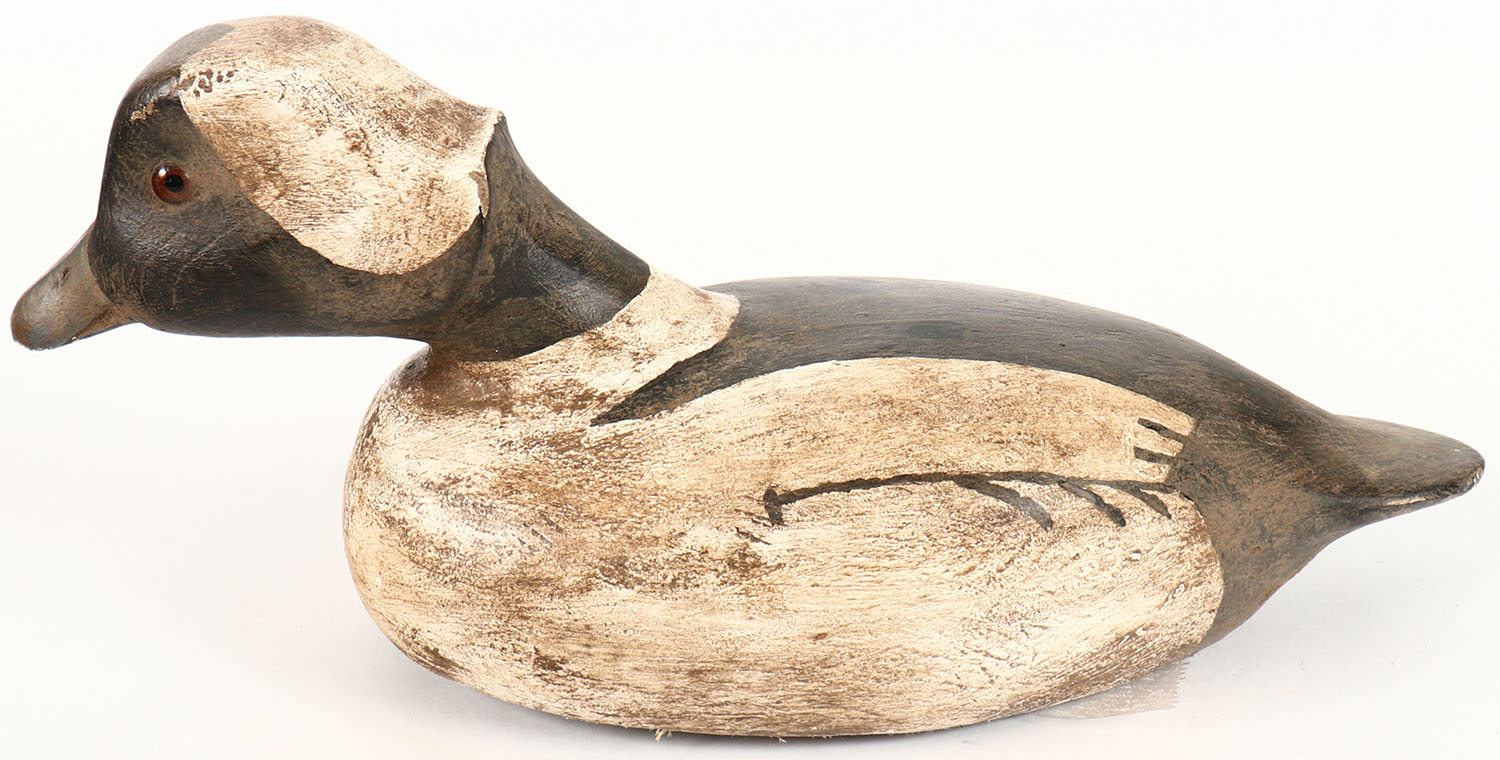 Bufflehead Drake by Maynard Caine, Gananoque, Ontario, GE, solid wood, original paint, structurally excellent, marked on bottom, 11 1/2'' OAL. Grade: Excellent - Value: 10 to 30