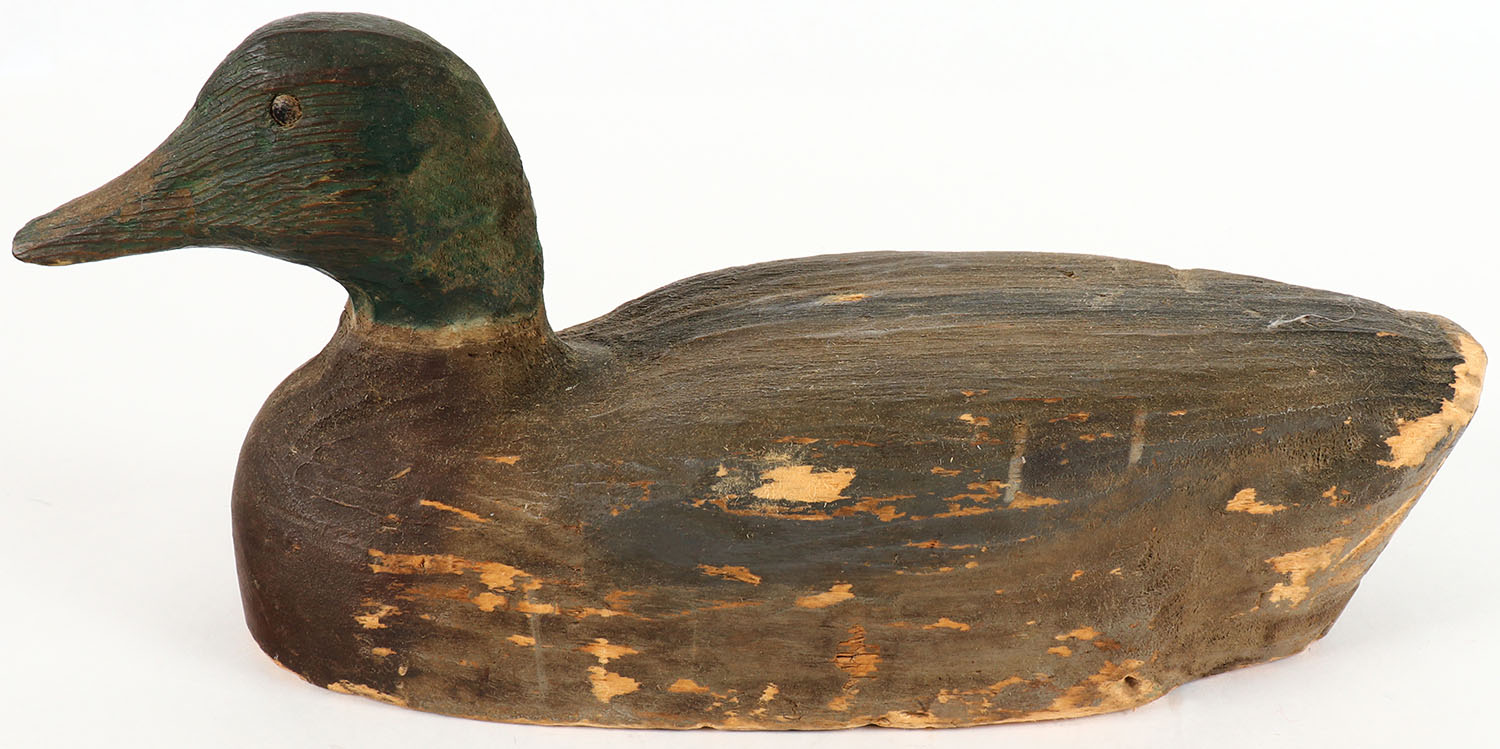 Mallard Drake by Herter's???, GE, balsa wood, original paint shows wear with chip to tip of bill, structurally excellent, 13'' OAL. Grade: Very Good + - Value: 10 to 40