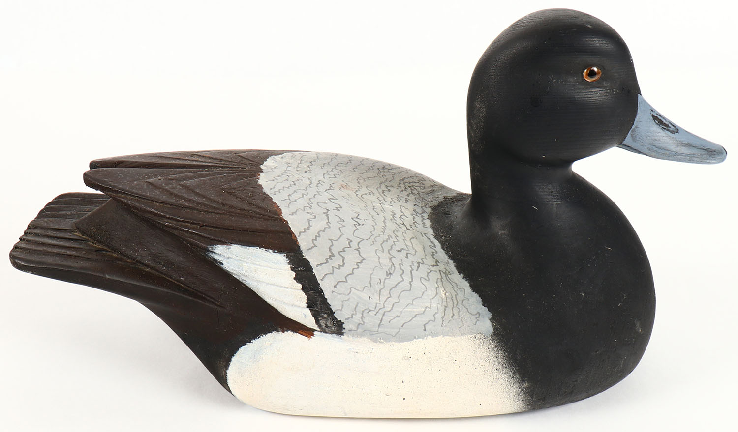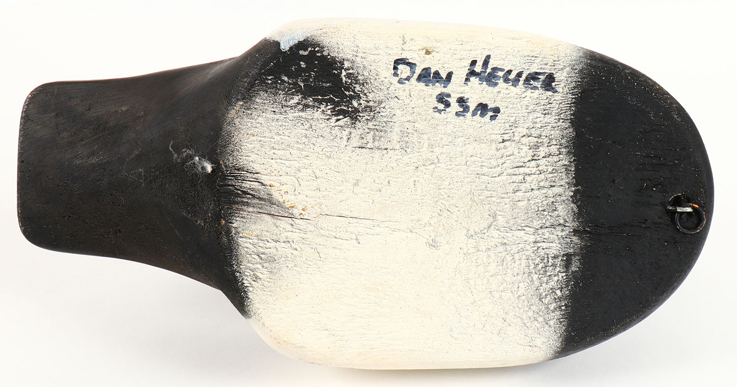 Bluebill Drake by Dan Heuer, Sault STE, Marie MI, glass eyes, solid wood, original paint, structurally excellent, also signed SSM, 13 1/2'' OAL. Grade: Excellent ++ - Value: 100 to 500