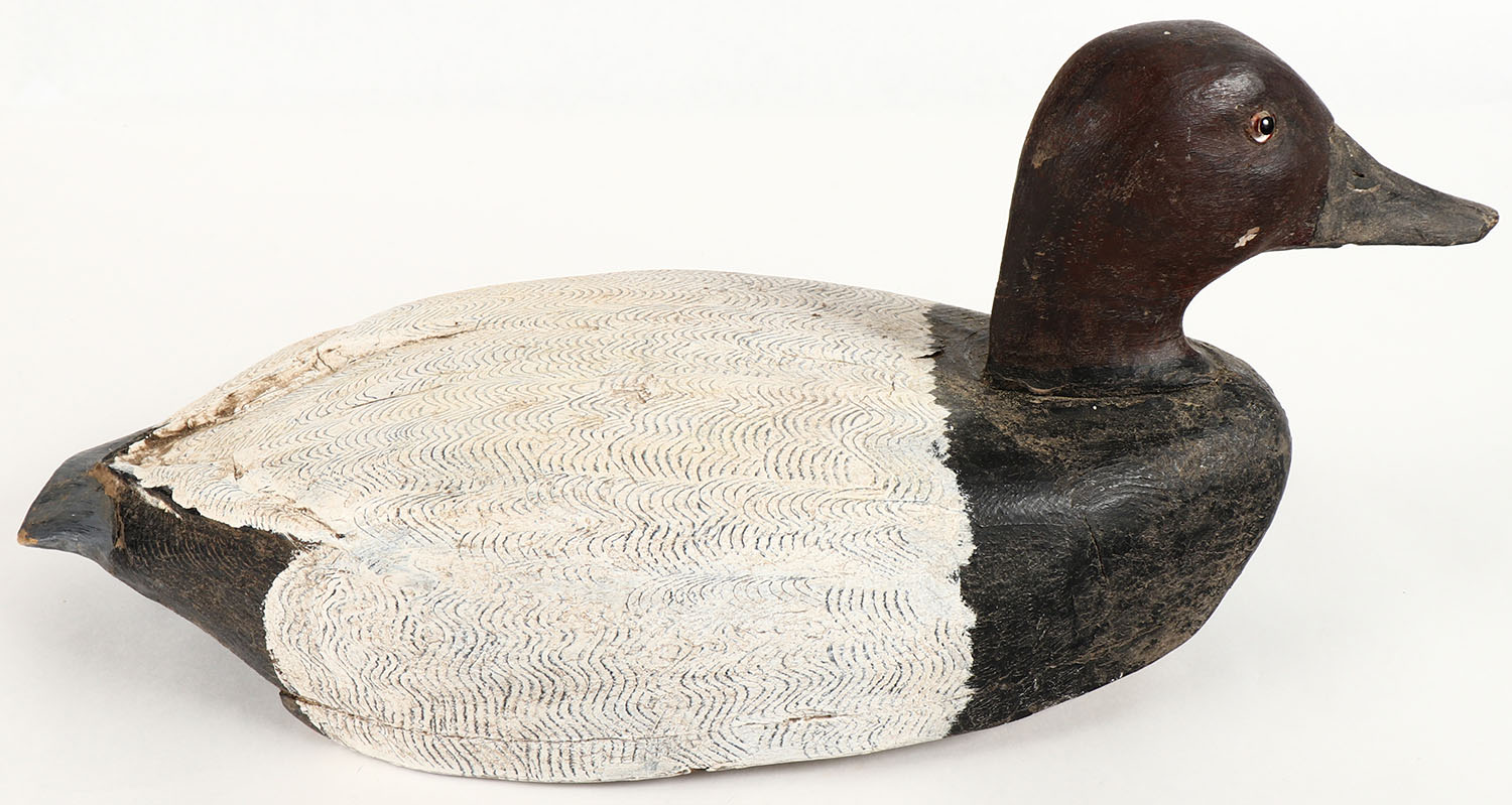 Canvasback Drake by Walter Sinclair, Long Point Lake Erie PA, GE, hollow wood, original comb paint, structurally excellent, 16'' OAL. Grade: Very Good ++ - Value: 20 to 40