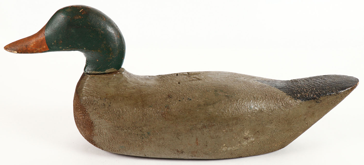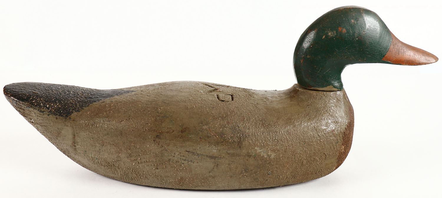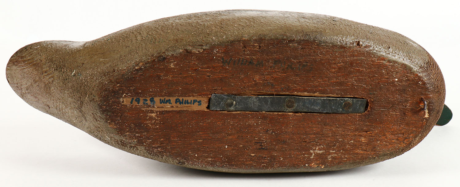 Mallard Drake by William Philips, no eyes, solid wood, original paint, structurally excellent, branded on top of back & signed on bottom, 17'' OAL. Grade: Excellent - Value: 20 to 40