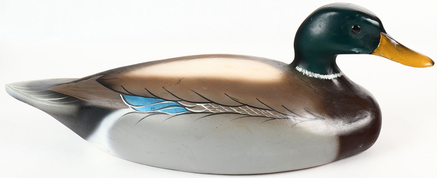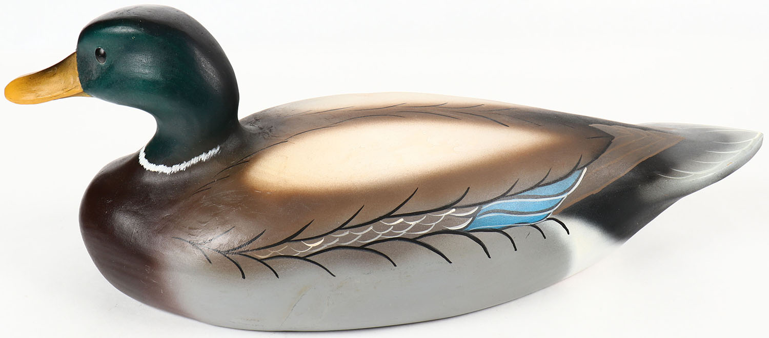 Mallard Drake by Michael Veasey, Delaware, GE, solid wood, original paint, structurally excellent, signed on bottom by maker, 17 1/4'' OAL. Grade: Excellent + - Value: 30 to 60