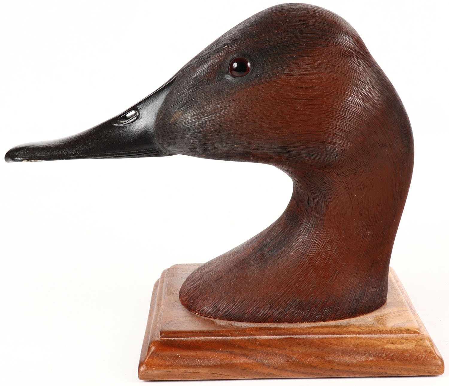 Canvasback Drake Head by Richard & Janis Korte, Olympia, WA, circa 1980, GE, solid wood with feather detail, mint original paint, mounted on a wood base, 7 1/2'' width. Grade: MINT - Value: 20 to 60