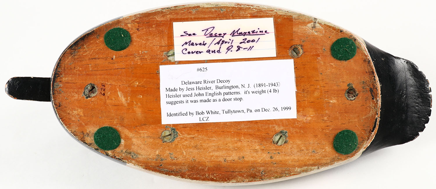Canvasback Drake by Jess Heisler, Burlington NJ, (1861-1943), Heisler used John English patterns, it's weight of 4lbs suggests it was made as a door stop, GE, solid wood with lead in body, original paint, 14 1/2'' OAL. Grade: Excellent - Value: 30 to 90