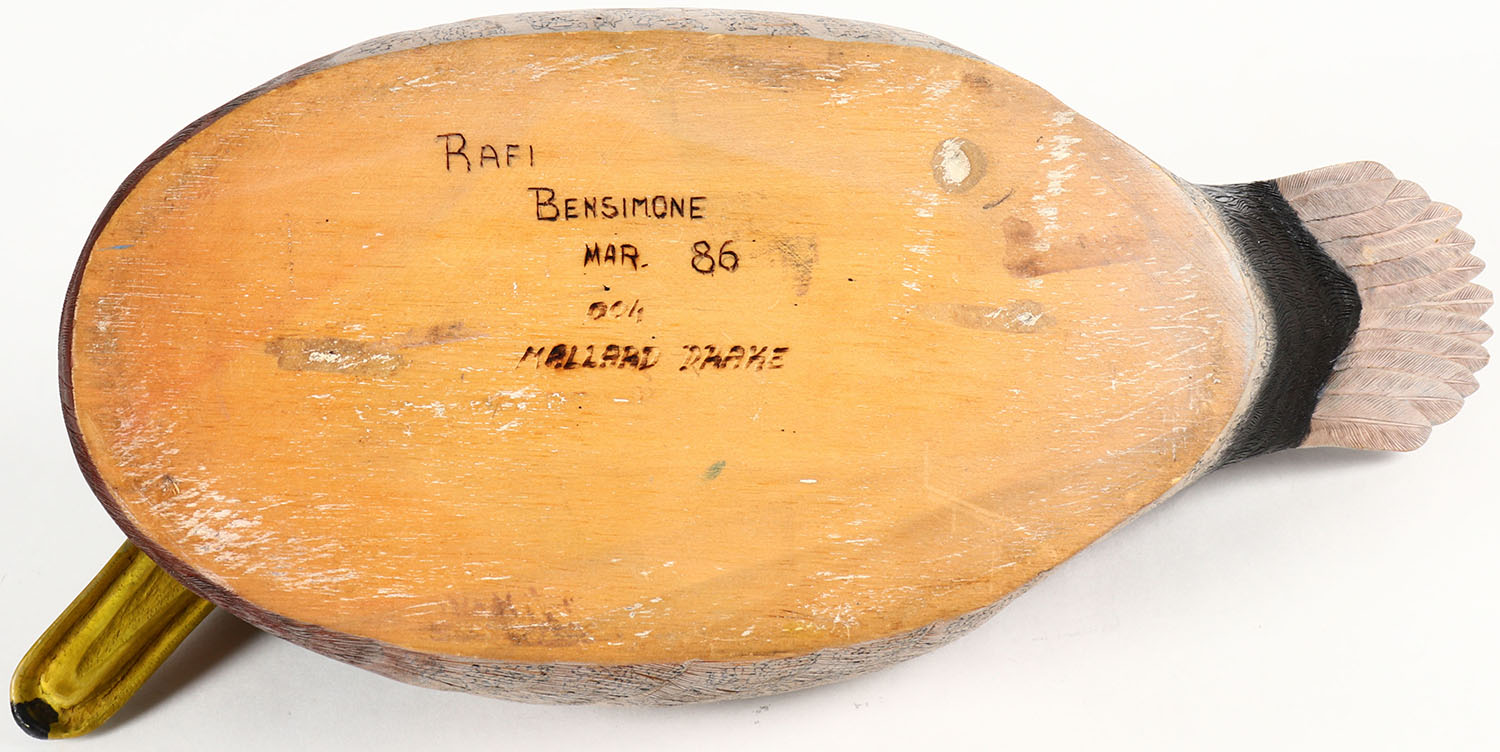 Mallard Drake by Rafi Bensimone, 1986, GE, solid wood mint original paint with wonderful feather detail, 10 wing tip feathers are individually carved with detail feathering, signed on bottom, 14 1/2'' OAL. Grade: Excellent ++ - Value: 30 to 90