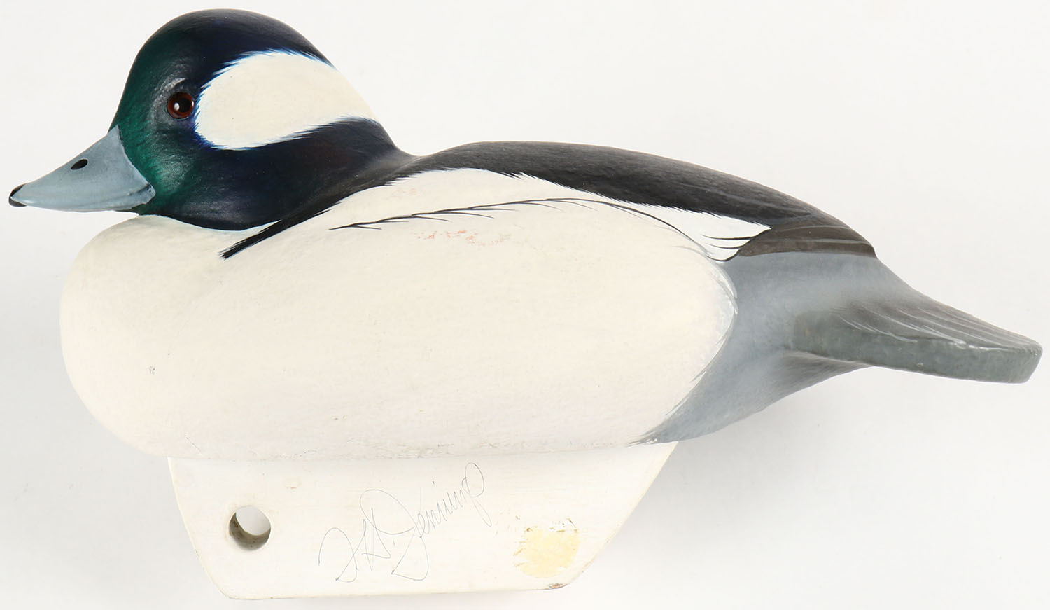 Low Head Bufflehead Drake by F H Jennings, GE, soldi wood original paint, branded FHJ & signed, 11'' OAL. Grade: Excellent ++ - Value: 30 to 90