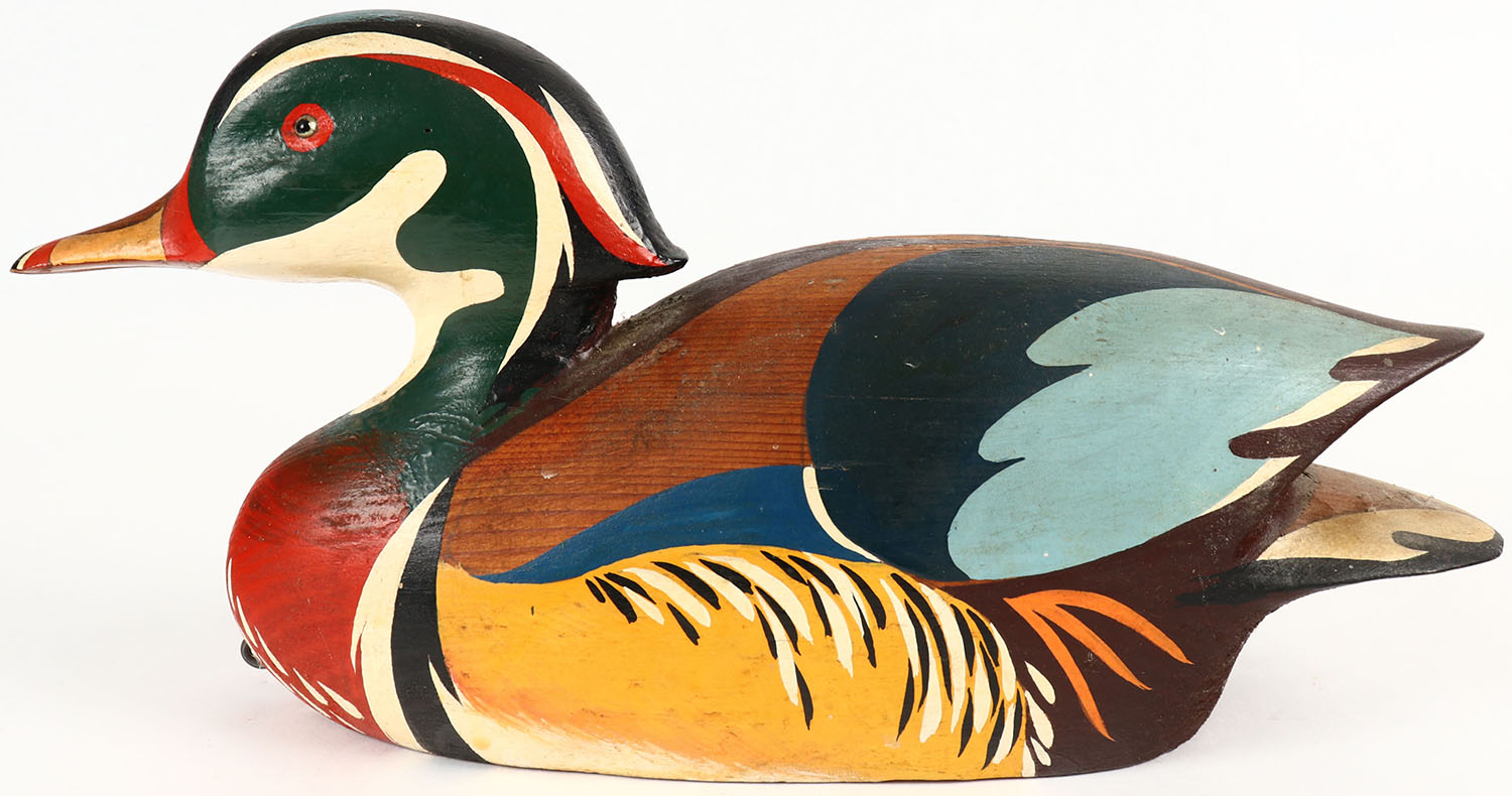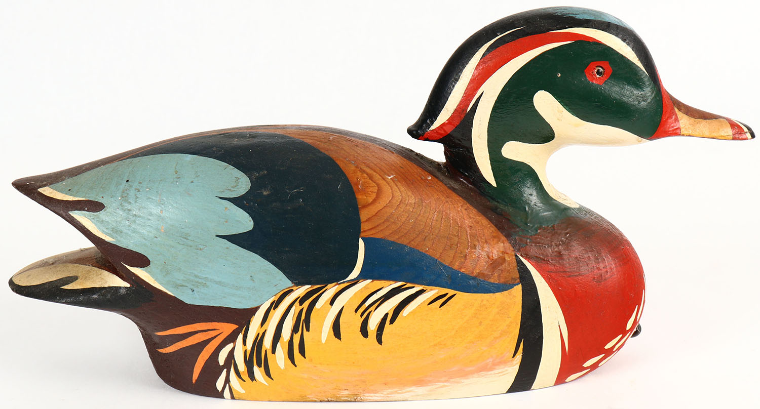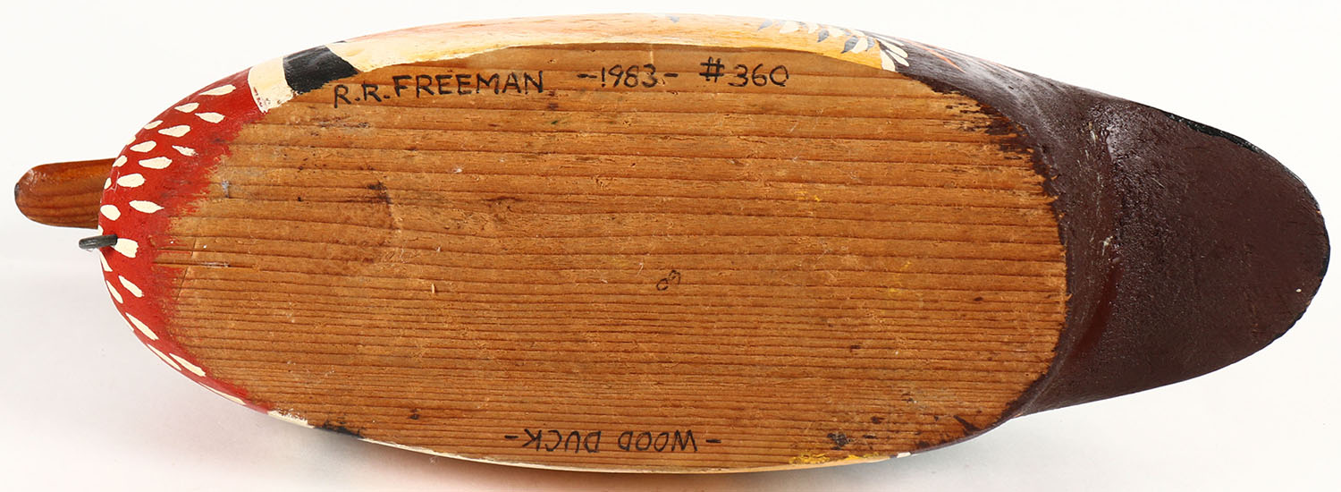 Woodduck Drake by R.R. Freeman, 1983, PE, hollow wood, excellent original paint, 12'' OAL. Grade: Excellent - Value: 20 to 60