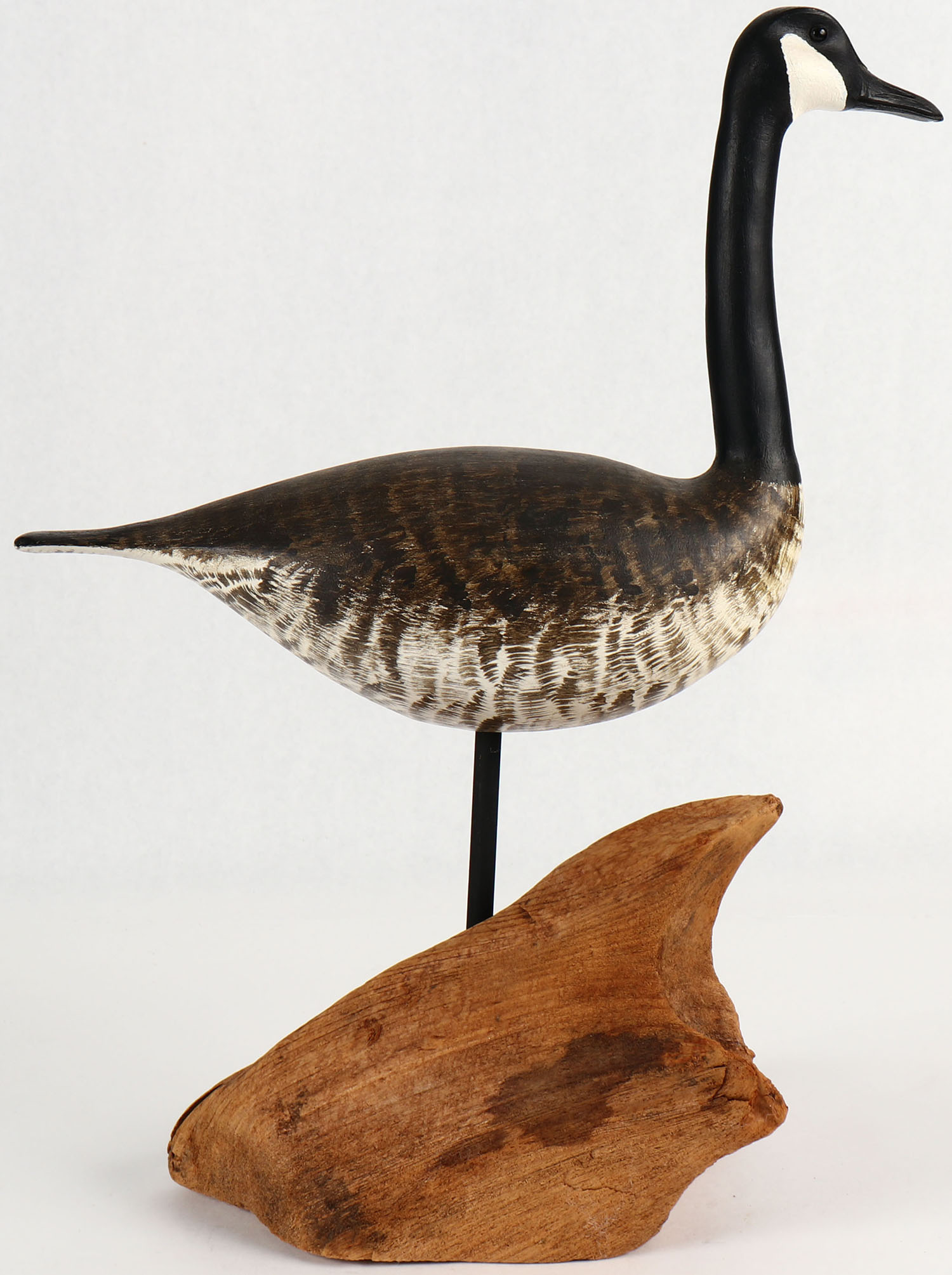 Miniature Canada Goose on stand by Lee R. Schceley, Chincoteague, Virginia, branded LRS & signed on bottom of stand & decoy, GE, solid wood, mint original paint, 13'' OAL. Grade: Excellent ++ - Value: 20 to 60