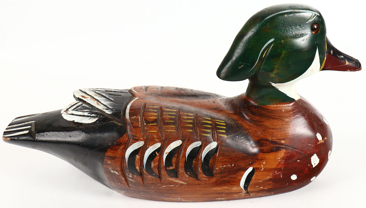 Woodduck Drake by unknown maker, GE, solid wood, original paint, repaired bill crack, 13'' OAL. Grade: Excellent - Value: 20 to 60