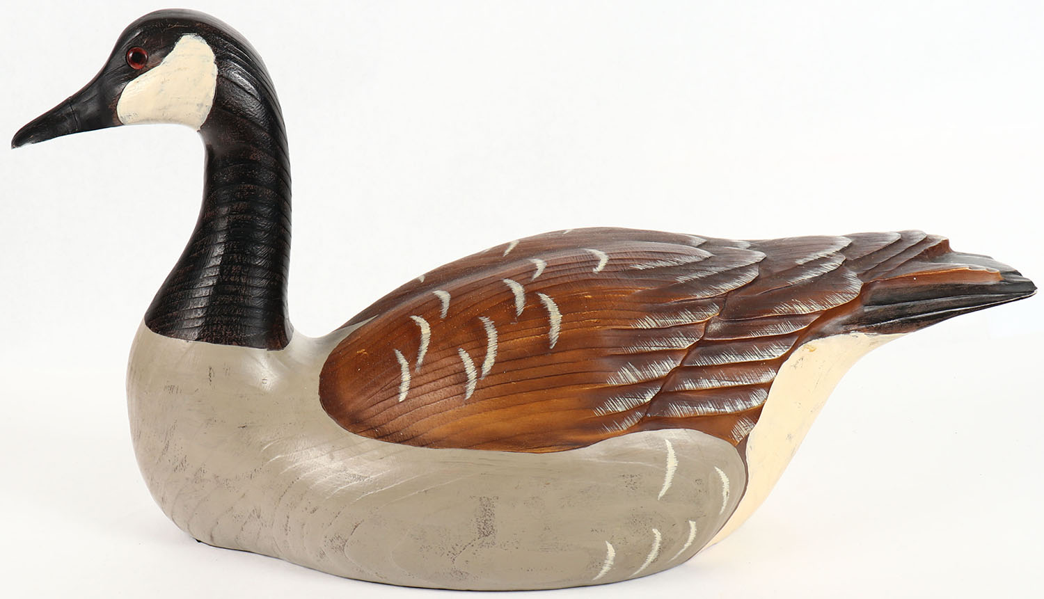 Canada Goose by Tom Taber, has gold DU coin, GE, solid wood, original paint, 20'' OAL. Grade: Excellent - Value: 30 to 100