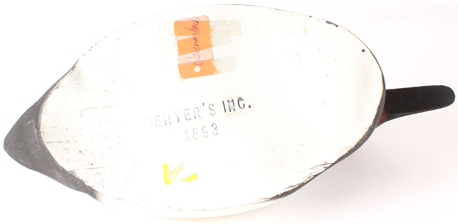 Canvasback Drake by Herters Decoy Co., Waseca, MN, 1893 series glass eyes, solid wood, original paint, structurally excellent, branded on bottom. Grade: Excellent ++ - Value: 50 to 150