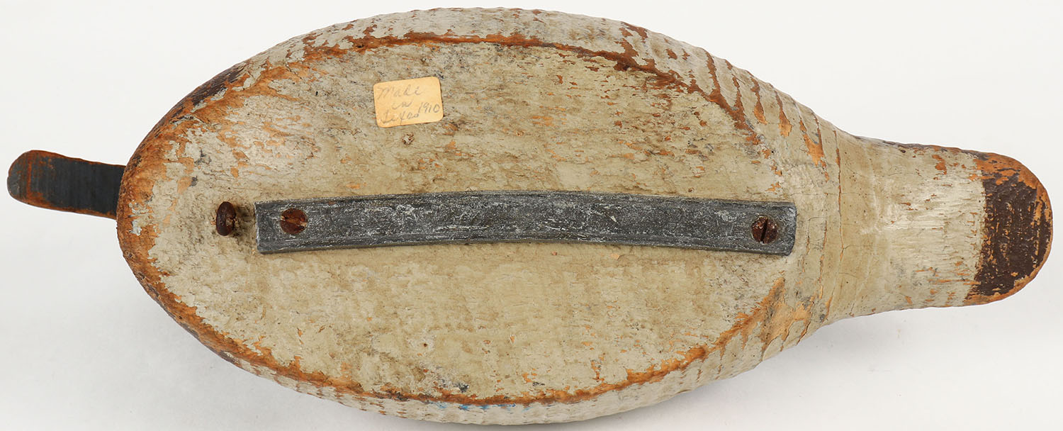 Bluebill Hen by a unknown factory decoy, glass eyes, solid wood, original paint show wear to edges, 13 1/2'' OAL. Grade: Very Good ++ - Value: 10 to 40