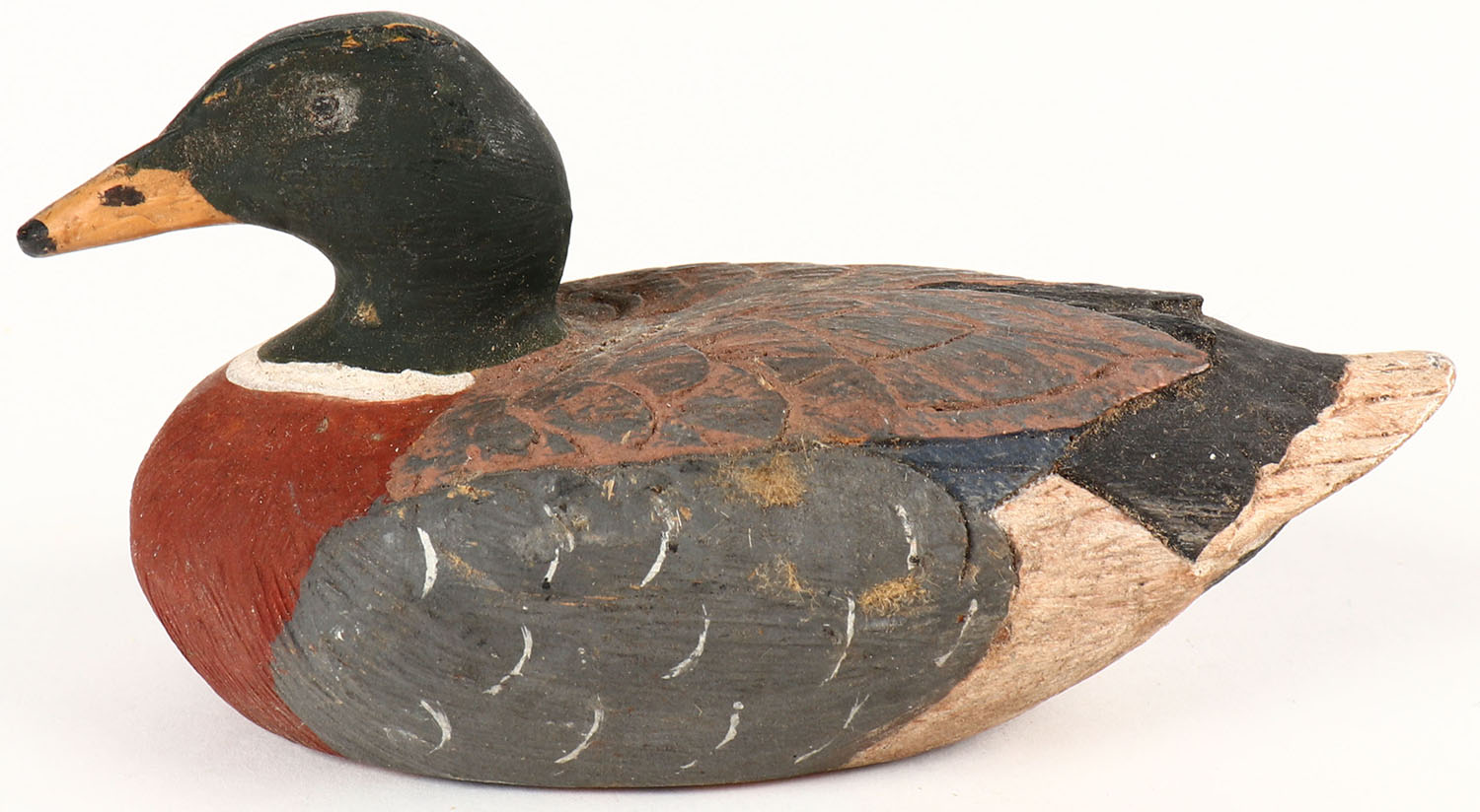 Miniature Mallard Drake by unknown maker, solid wood, original paint, 5'' OAL. Grade: Excellent - Value: 10 to 30