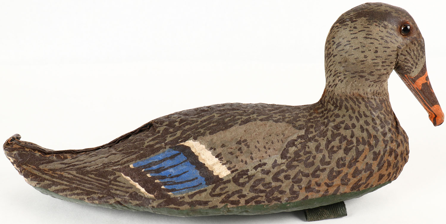 Mallard Hen by Oliveros Decoy Co., Houston, TX, glass eyes, canvas over cork, near mint original paint, structurally excellent. Grade: Excellent ++ - Value: 20 to 40