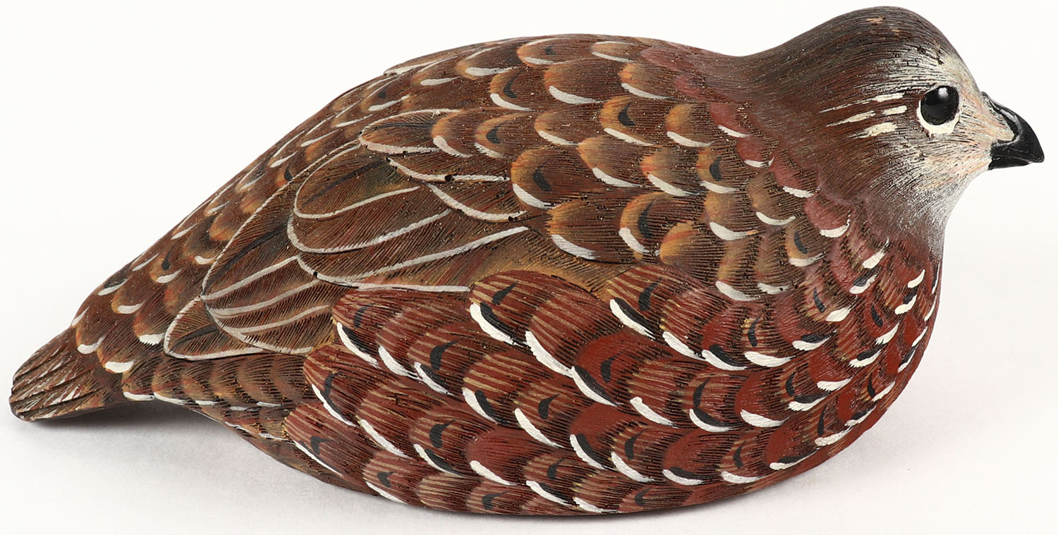 Bob White Quail by L. Finch, GE, solid wood, original paint, 7'' OAL. Grade: MINT - Value: 10 to 50