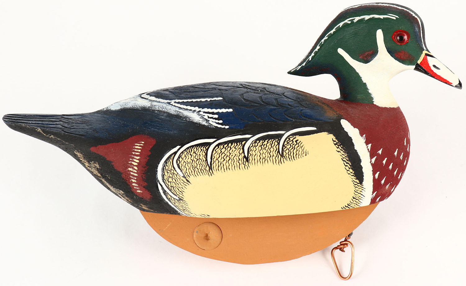 Woodduck Drake by Ralph Malpage, GE, solid wood, mint original paint, 14'' OAL. Grade: MINT - Value: 20 to 80