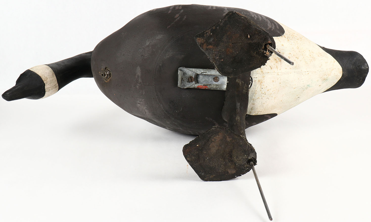 Early Canada Goose by unknown maker, PE, looks like you could have blowen this us as is it now hard rubber & a hole in the neck, large feet mounted on wood stand, 24'' OAL. Grade: Very Good - Value: 10 to 50