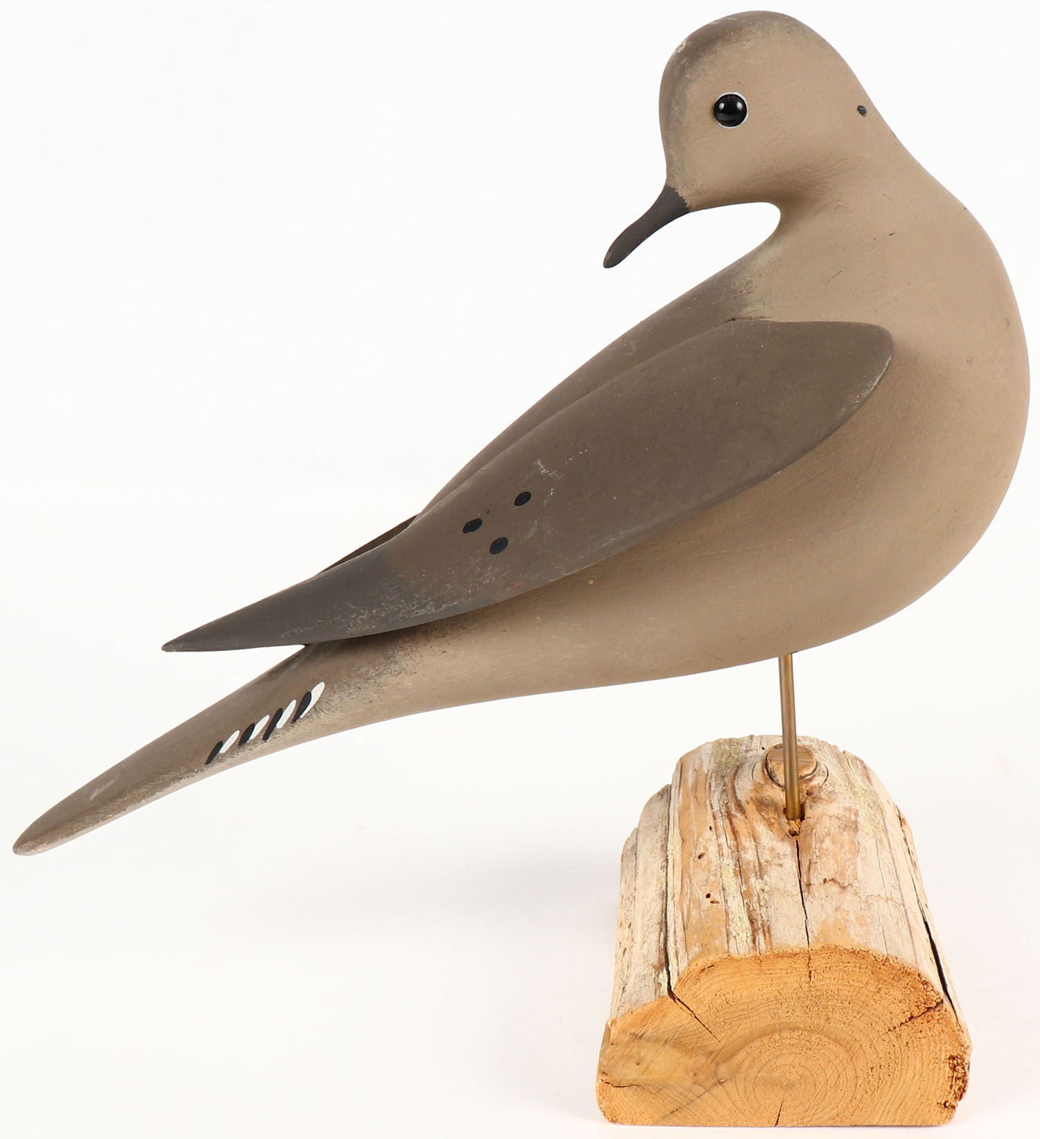 Morning Dove by J.P. Hand, GE, solid wood, original paint, mounted on stand, signed on bottom, 9'' OAL. Grade: Excellent - Value: 2 to 20