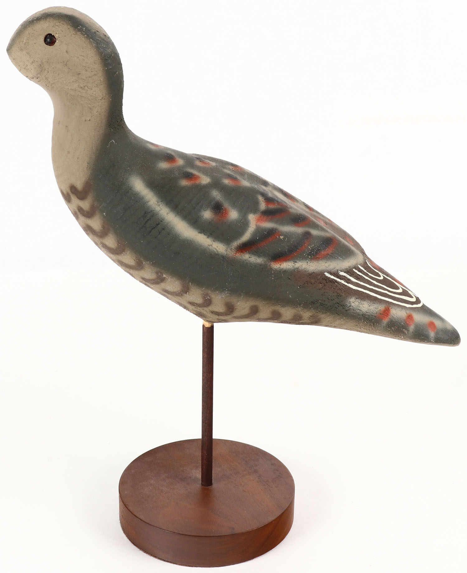 Shorebird by Herters, Minnesota, part of the 1893 series from the 1960s, glass eyes, solid wood, original paint, no bill, structurally excellent. Grade: Excellent - Value: 20 to 60
