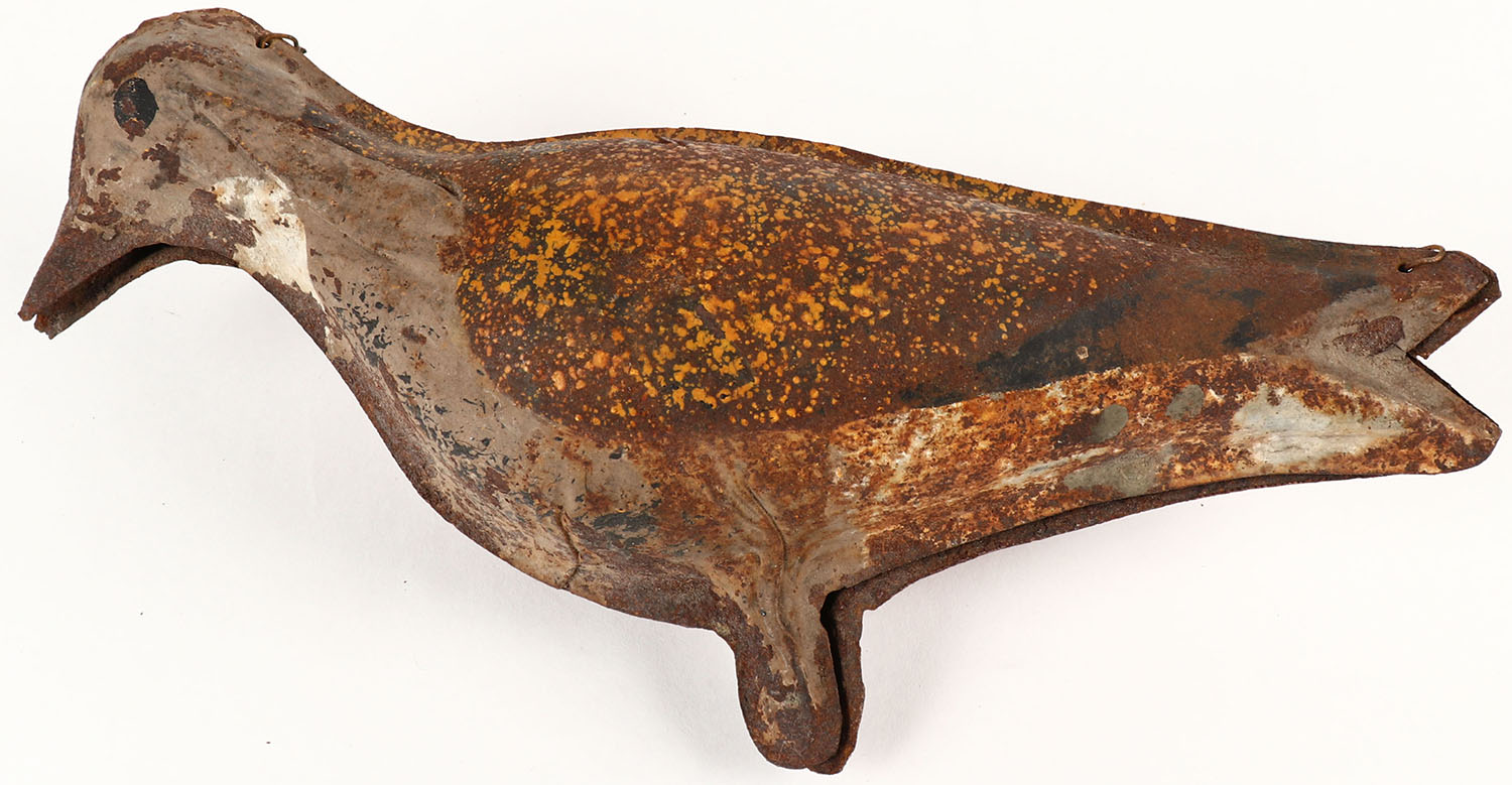 Metal 2pc. Yellowlegs, Shorebird by Strater & Sohier, Boston MA, painted eyes, with wire hinges, original paint shows lots of rust, 10'' OAL. Grade: Good - Value: 2 to 40