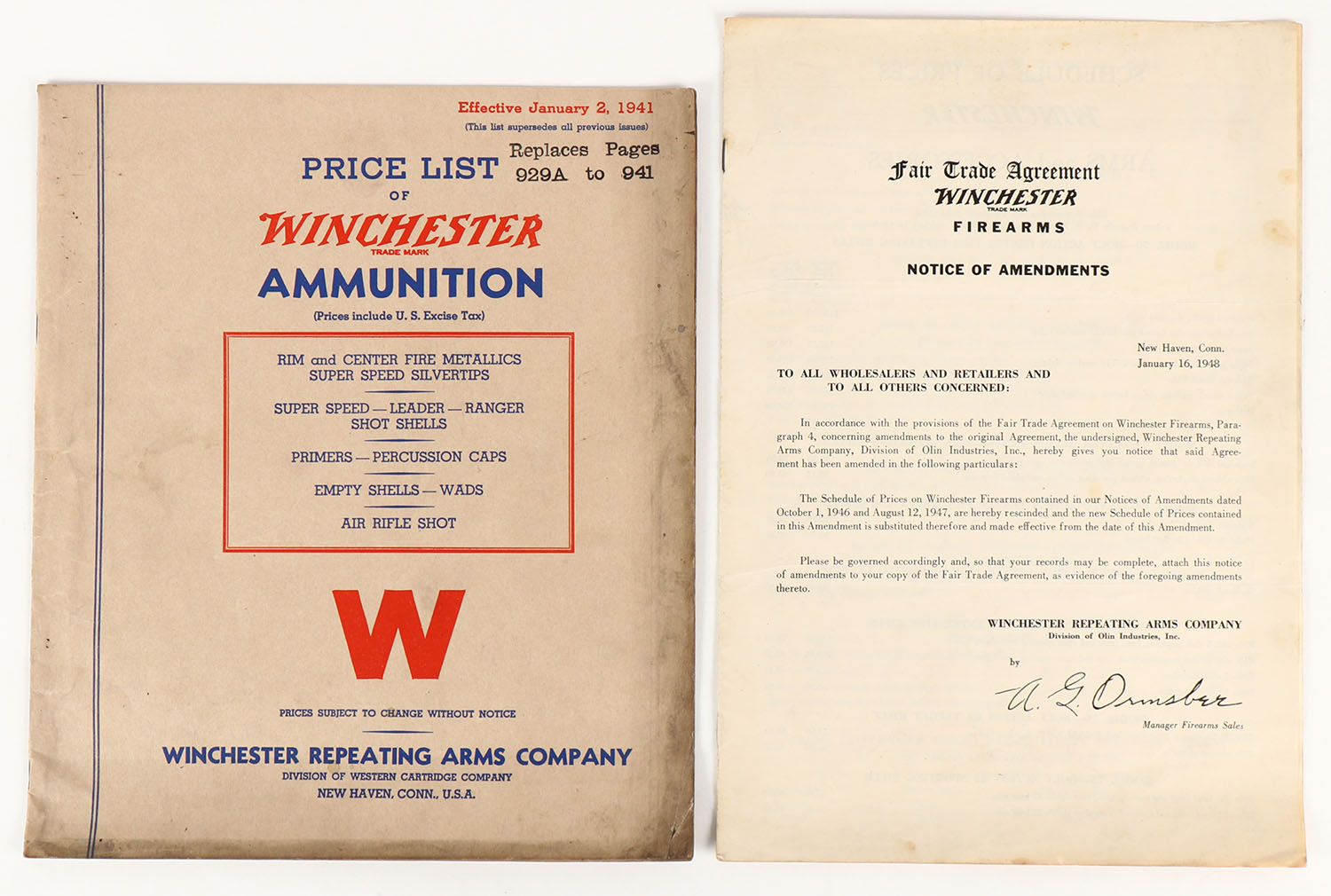 Lot of 2, (1)Price List Of Winchester Ammunition 1941, 9 1/2'' x 11'', 18 pages, pages age soiled, binding tight, paper cover good with age soiling around edges (2)Fair Trade Agreement Winchester Firearms Notice Of Amendments, 1948, 8 1/2'' x 12'', 4 pages, pages age soiled, binding tight, paper cover soiled. Grade: Good ++ - Value: 20 to 80