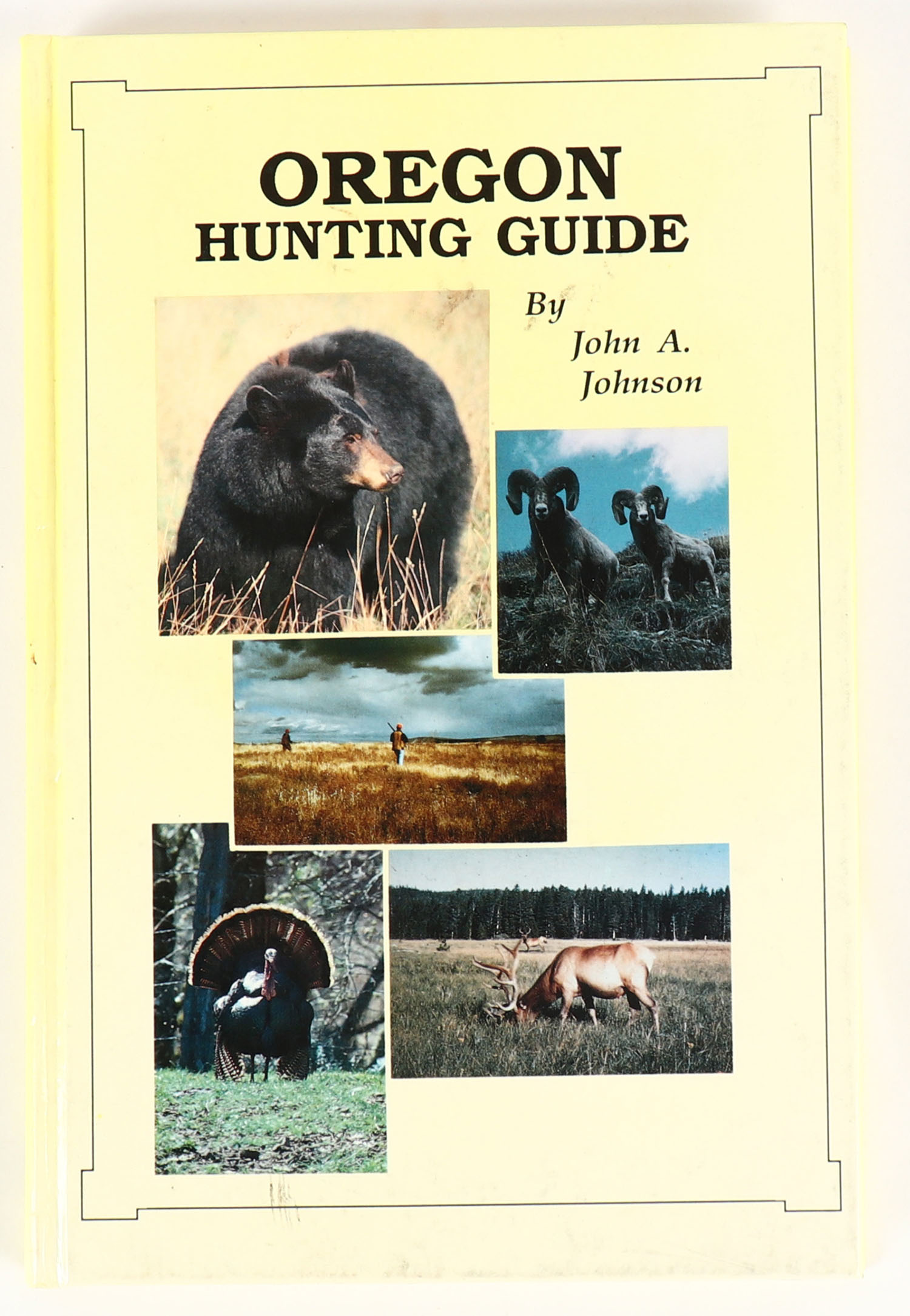 Oregon Hunting Guide by John A. Johnson, 1988, signed, 6'' x 9 1/2'', 175 pages, pages clean, binding tight, b/w images, hardcover good ++ with some soiling. Grade: Very Good - Value: 20 to 55