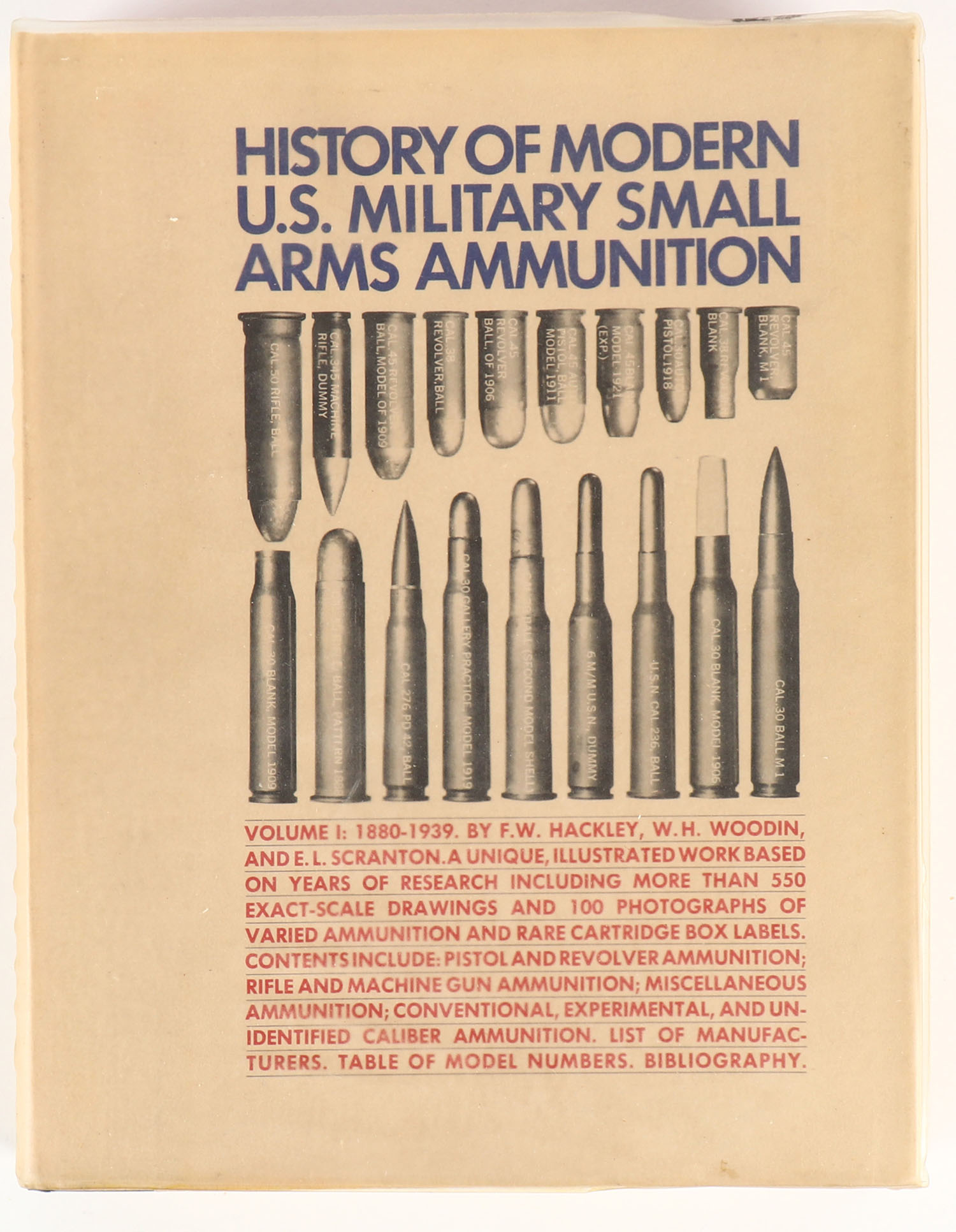History Of Modern U.S. Military Small Arms Ammunition Volume One 1880-1939 by F.W. Hackley W.H. Woodin and E.L. Scranton, 1967, 9'' x 11 1/2'', 315 pages, pages clean, binding tight, b/w images, hardcover excellent, dust jacket excellent, plastic jacket very good with soiling. Grade: Excellent - Value: 40 to 200
