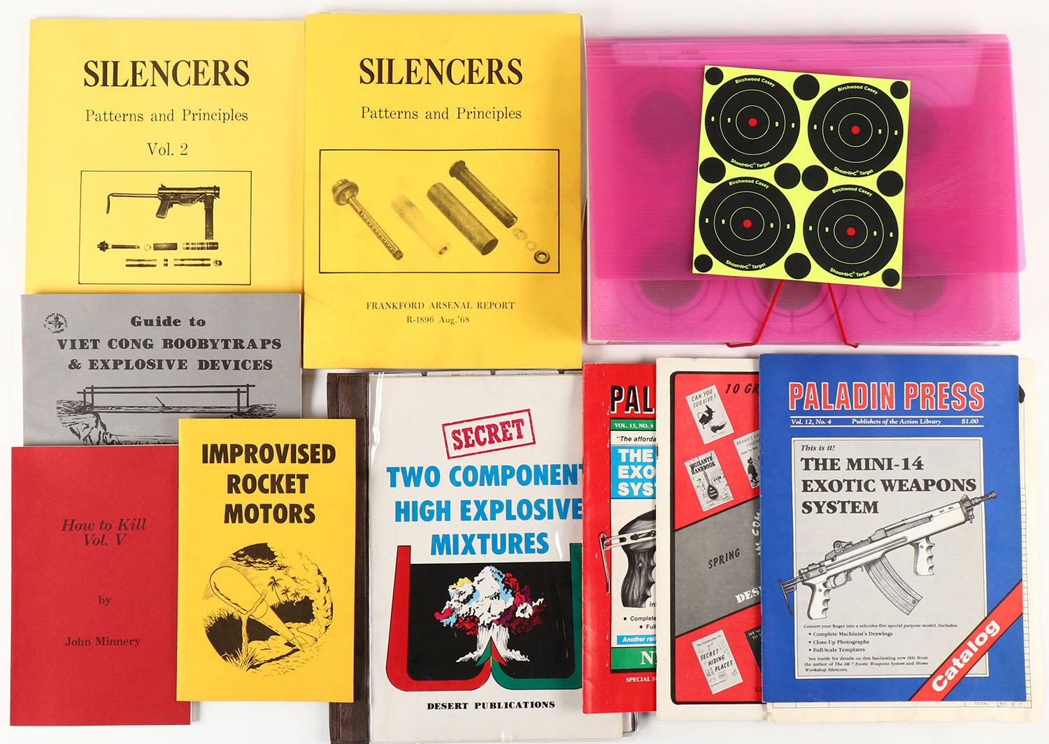 Lot of 10, (1) The Combat Bookshelf Desert Publications Spring 1981, (2) The Mini14 Exotic Weapons System Paladin Press Catalog, (3) The Ruger 1022 Exotix Weapons System Paladin Press, (4)Two Component High Explosive Mixtures Desert Publications, (5) Guide To Viet Cong Boobytraps And Explosive Devices, (6) How To Kill Volume 1, (7) Improvised Rocket Motors, (8) Silencers Patterns and Principles (9) Silencers Patterns and Principles Vol 2, (10) Misc paper targets. - Value: 2 to 40