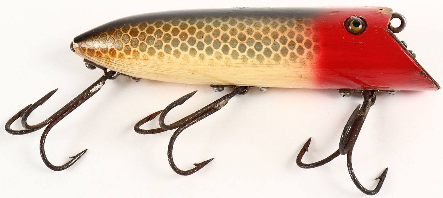 Heddon Basser, wood lure, GE, Red head Shiner Scale, 3 hooks, lip marked, bar hdw, 4''. Grade: Excellent - Value: 90 to 150